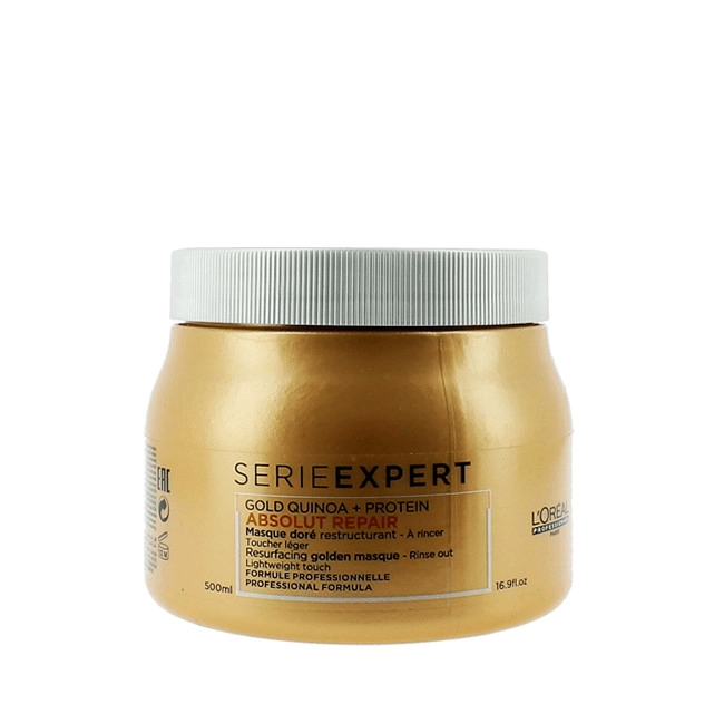 ERIE EXPERTA - REPARACIN ABSOLUTA - QUINOA DE ORO PROTENA por LOréal Professionnel. Mascara de cabello. Proviene de una serie profesional de cosméticos para el cuidado del cabello especializado. Diseñado para hilos expuestos a factores externos nocivos, así como dañados y debilitados por procedimientos cotidianos como el secado y el alisado. Perfectamente nutre, alisa y restaura el aspecto saludable del cabello. Además, se ha enriquecido con extracto de quinua y proteínas que penetran profundamente en el cabello, fortaleciéndolo y nutriéndolo tanto por fuera como por dentro. Gracias al uso regular, el cabello es más fuerte y no se friza. El producto está disponible en un práctico frasco de 500 ml.
