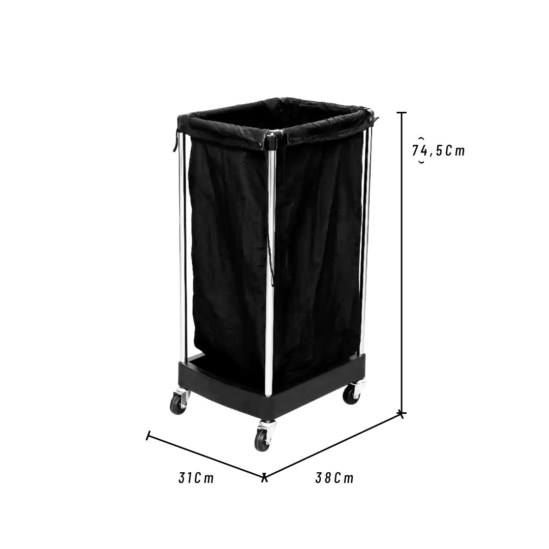 Carrito porta toallas de diseño funcional, con estructura de metal y base resistente. Incluye una bolsa de tela extraíble para almacenar toallas, sostenida por un marco tubular. Equipado con cuatro ruedas giratorias que facilitan su movilidad. Ideal para entornos como peluquerías, spas o salones de belleza.