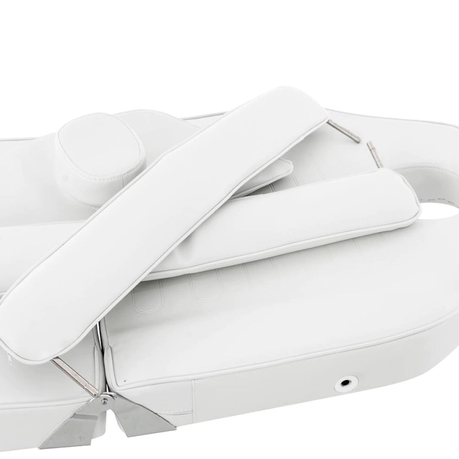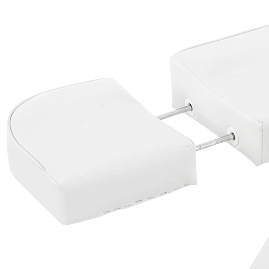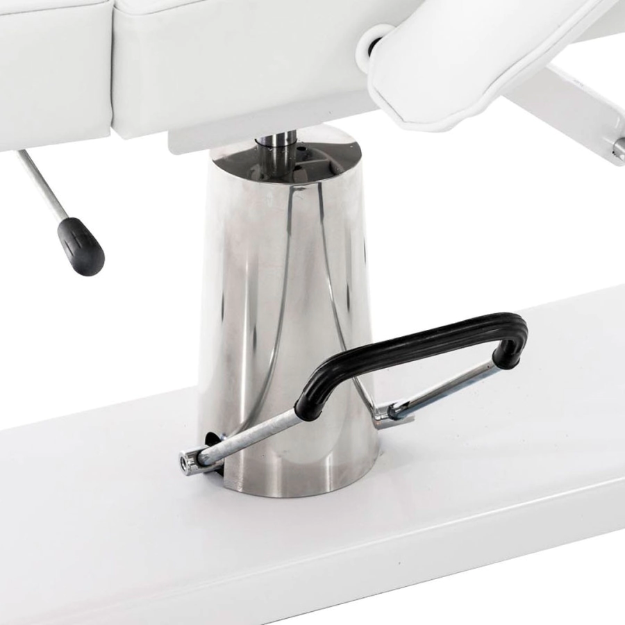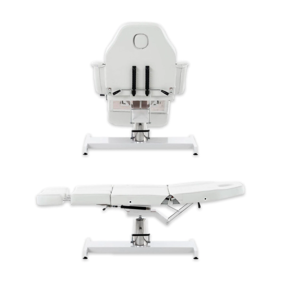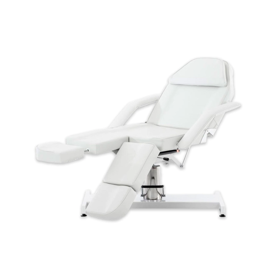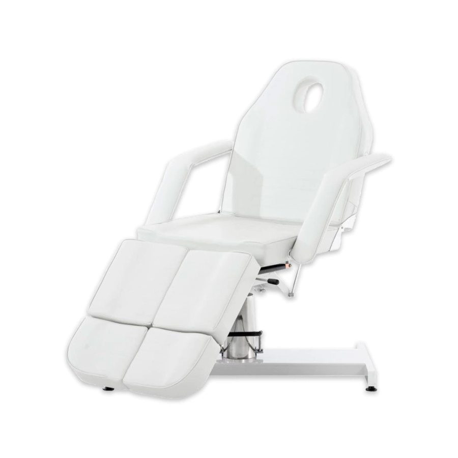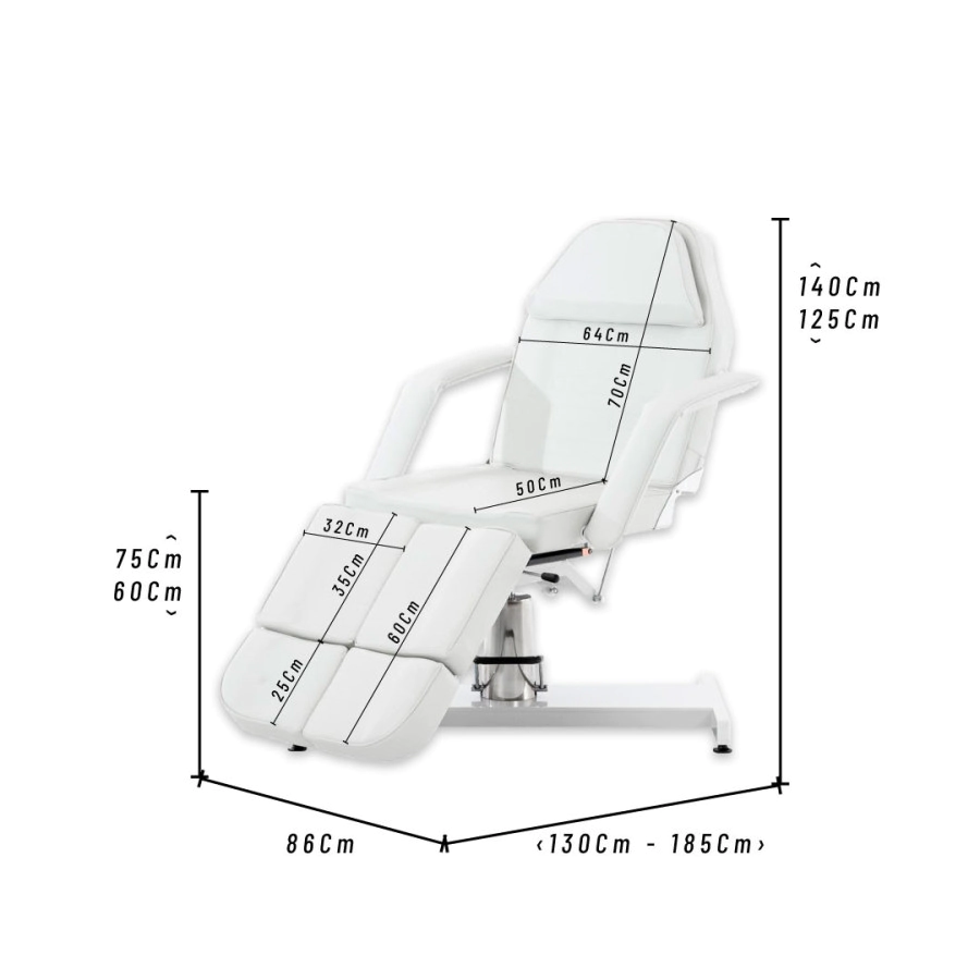 Esta camilla de masaje hidráulica proporciona bienestar puro para todos los tratamientos cosméticos, ya sean tratamientos faciales, de escote o corporales, son ideales para consultas odontológicas, de fisioterapia, etc. La camilla tiene una sección de pie dividida que se puede bloquear verticalmente o hasta 45 hacia abajo. Tiene un acolchado con espuma celular fina de alta calidad y una cubierto con cuero artificial de fácil cuidado. El pie resistente está hecho de metal y está provisto de protectores para el piso que pueden ajustarse individualmente a unos pocos centímetros de altura, para compensar los golpes. La altura de la camilla se puede ajustar hidráulicamente mediante una bomba de pie de 60 a 75 cm. El respaldo se puede plegar hacia atrás completamente o en posición vertical hasta 80 . La camilla se puede colocar completamente horizontal. Los reposabrazos son desmontables, pero también se adaptan a la posición acostada. La camilla se puede girar 360 . Debajo del reposacabezas extraíble hay una abertura en la cara, de modo que se pueden realizar masajes en esta cama.