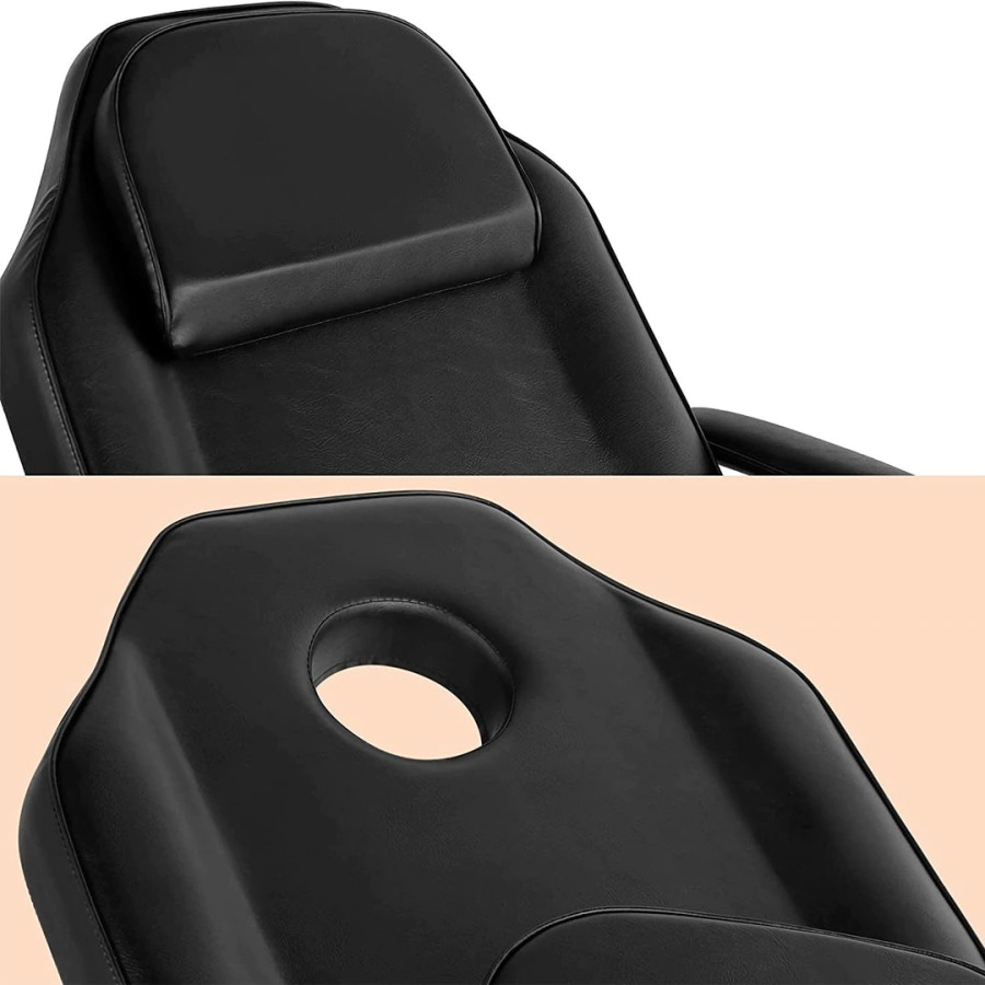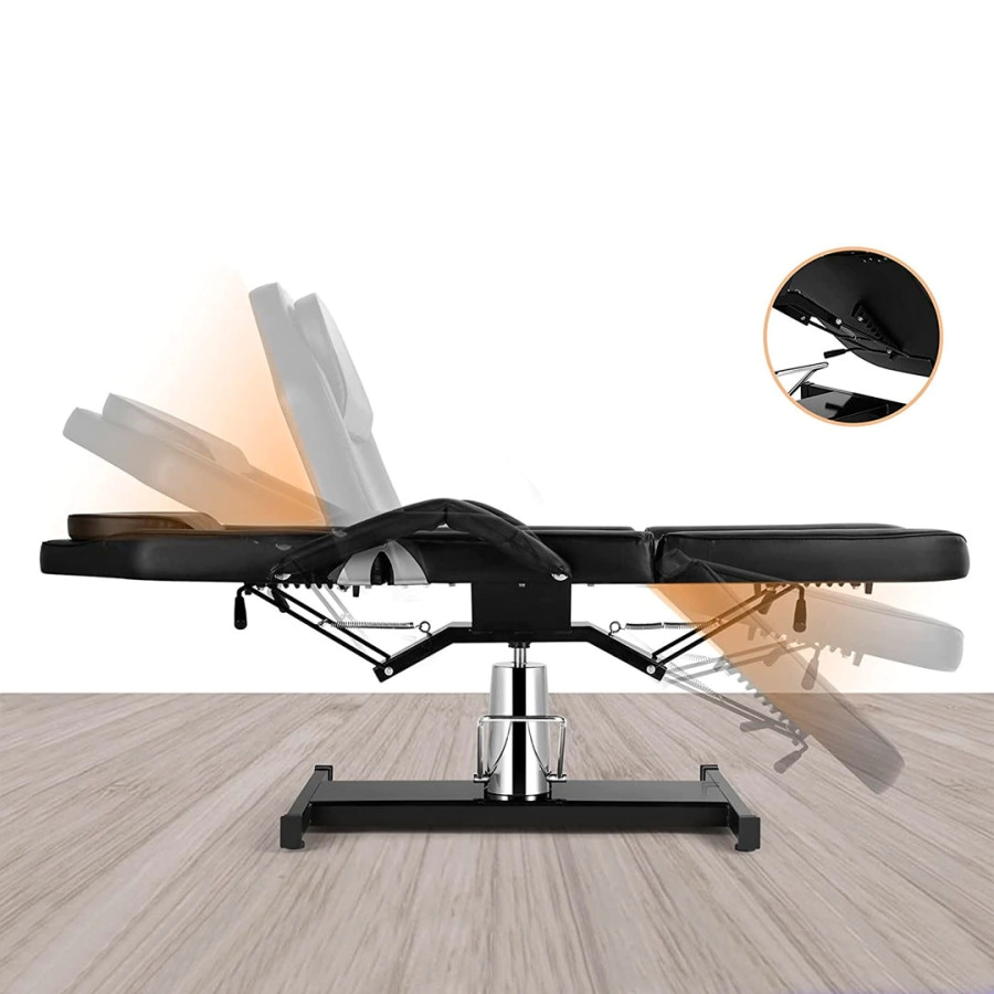 Con mecanismo de bloqueo que proporciona versatilidad y flexibilidad. La barra de pie facilita el ajuste de altura. La cama se puede ajustar fácilmente a múltiples posiciones de bloqueo con un mecanismo de liberación. La rotación libre ofrece una mejor comodidad para los esteticistas.