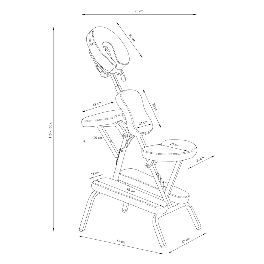 Apoyo para las rodillas - Apoyo en el pecho - Reposacabezas - marco de acero. Tapicería de cuero sintético de fácil limpieza. La silla es plegable para su fácil transporte y el relleno es de espuma de hasta 7 cm.
