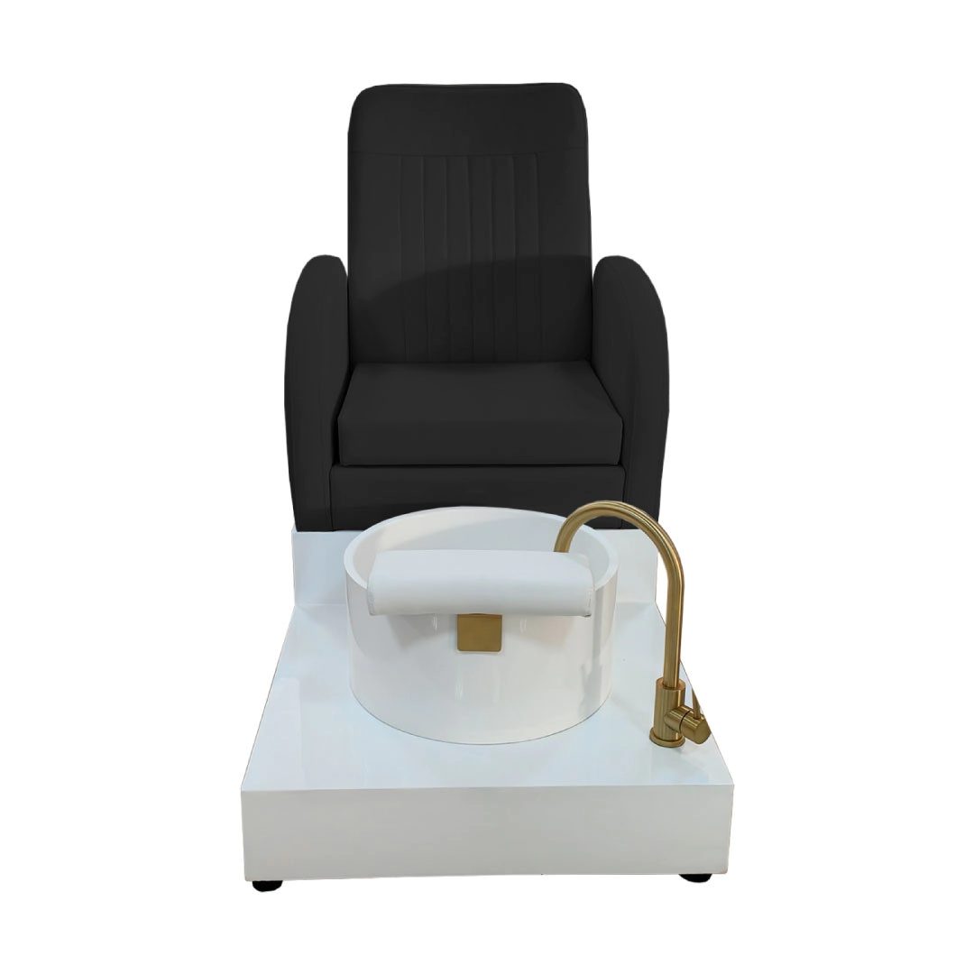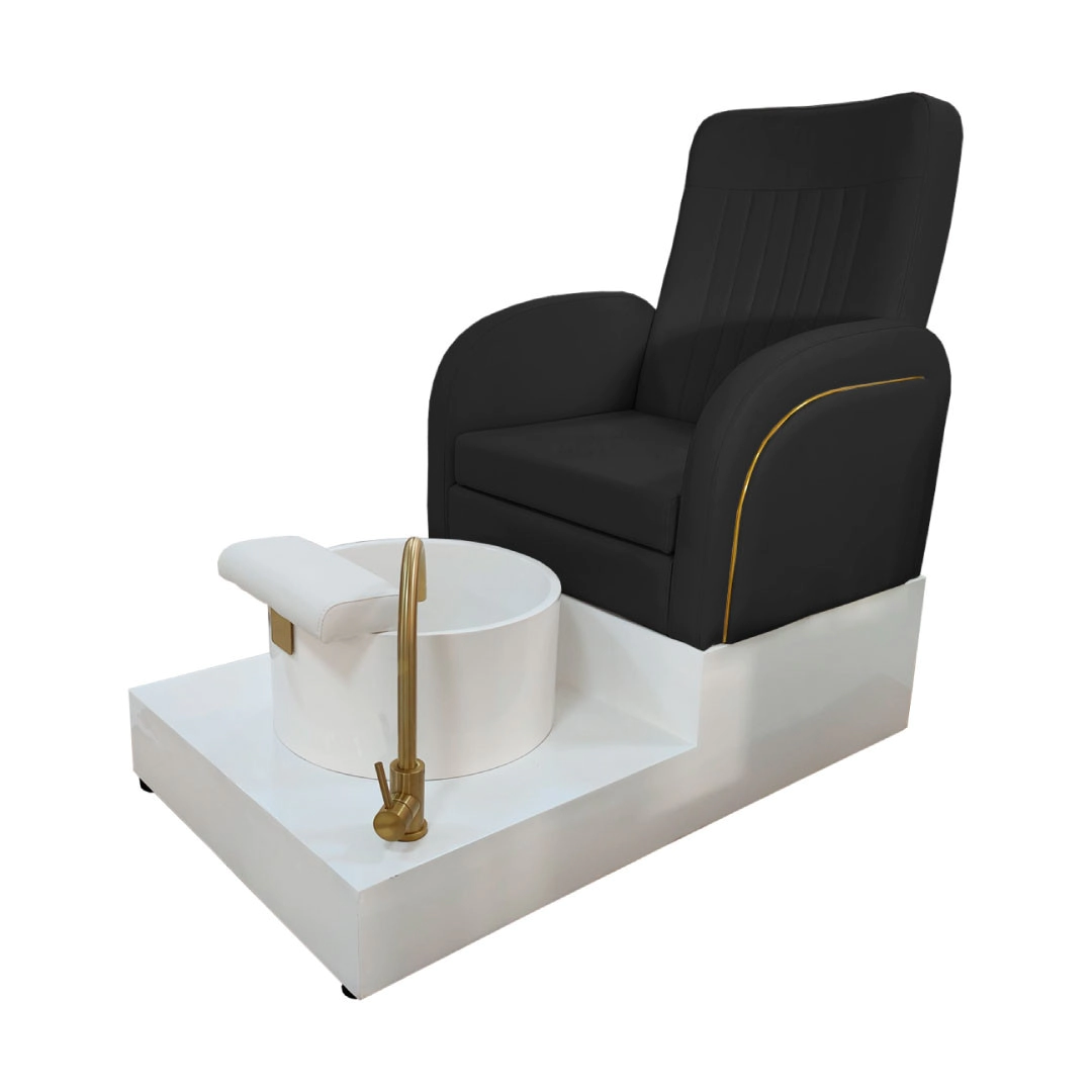 Diseño moderno y funcional, fabricado con esponja de alta densidad ideal para un SPA de pies. Cuenta con un asiento ergonómico en color blanco, acompañado de un cajón de almacenamiento práctico. Incluye una bacha con un espacio para remojo de pies, equipado con un grifo y un reposapiés acolchado, diseñado para ofrecer comodidad y facilidad durante los tratamientos.