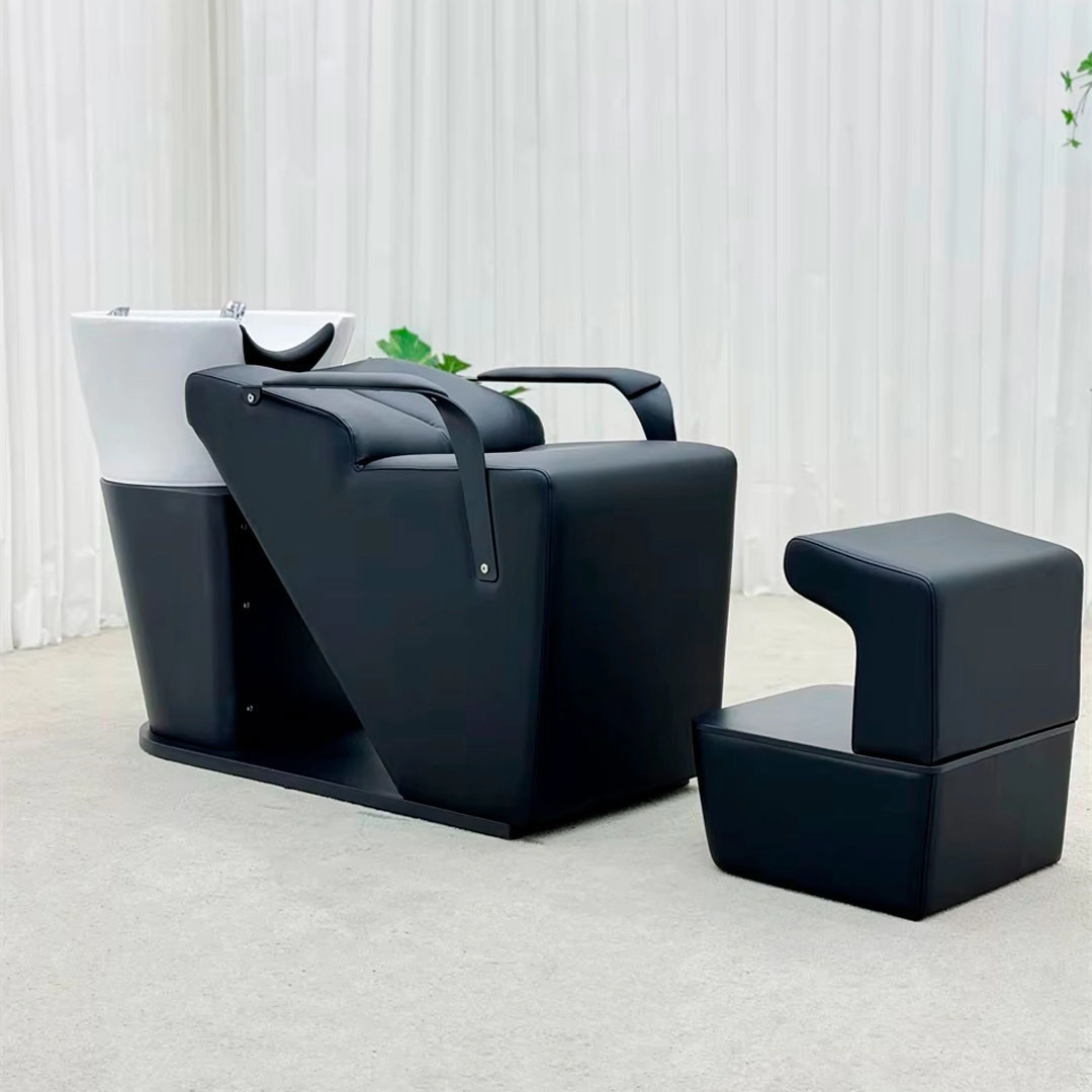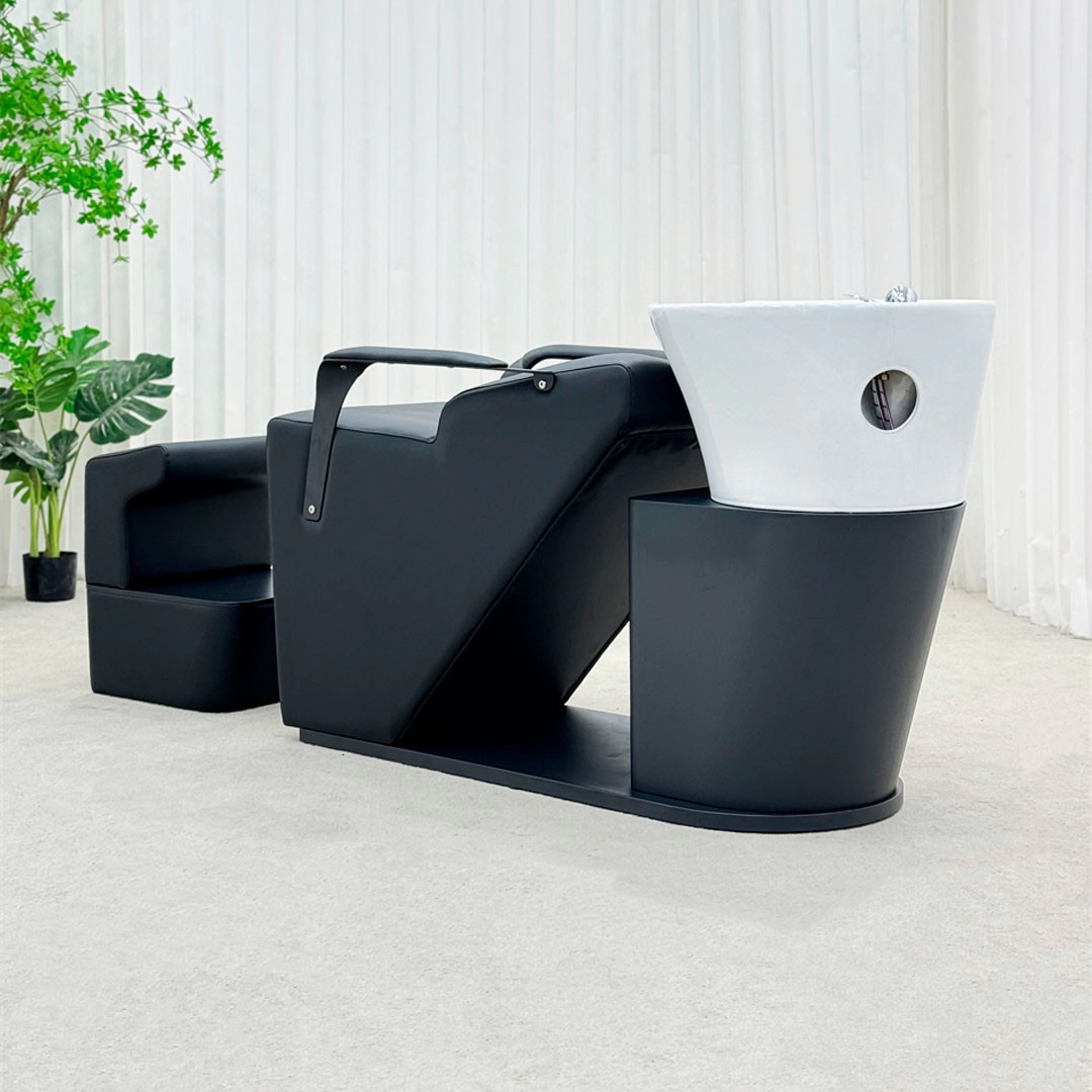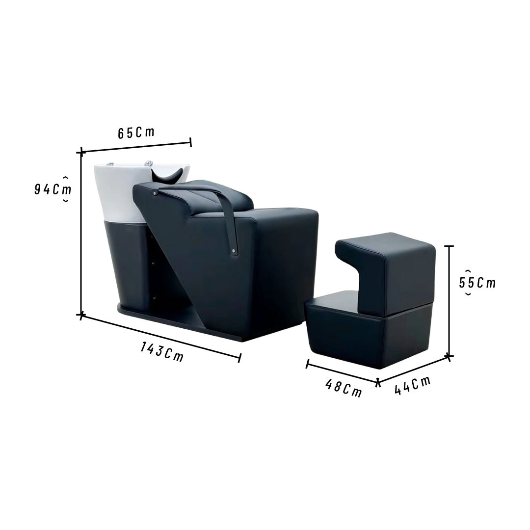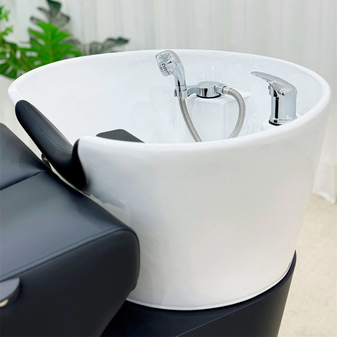 Diseño moderno y ergonómico, ideal para peluquerías. La bacha, fabricada en cerámica, tiene una forma anatómica que facilita el lavado del cabello, especialmente en cabellos largos y voluminosos, con un borde curvado para mayor comodidad en la zona del cuello. Ofrece un soporte acolchado, acompañado de reposabrazos integrados para mayor ergonomía. También incluye una base robusta y un sistema de plomería que permite una instalación sencilla.
