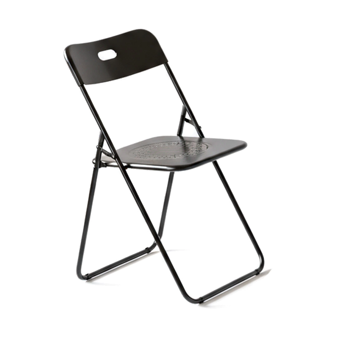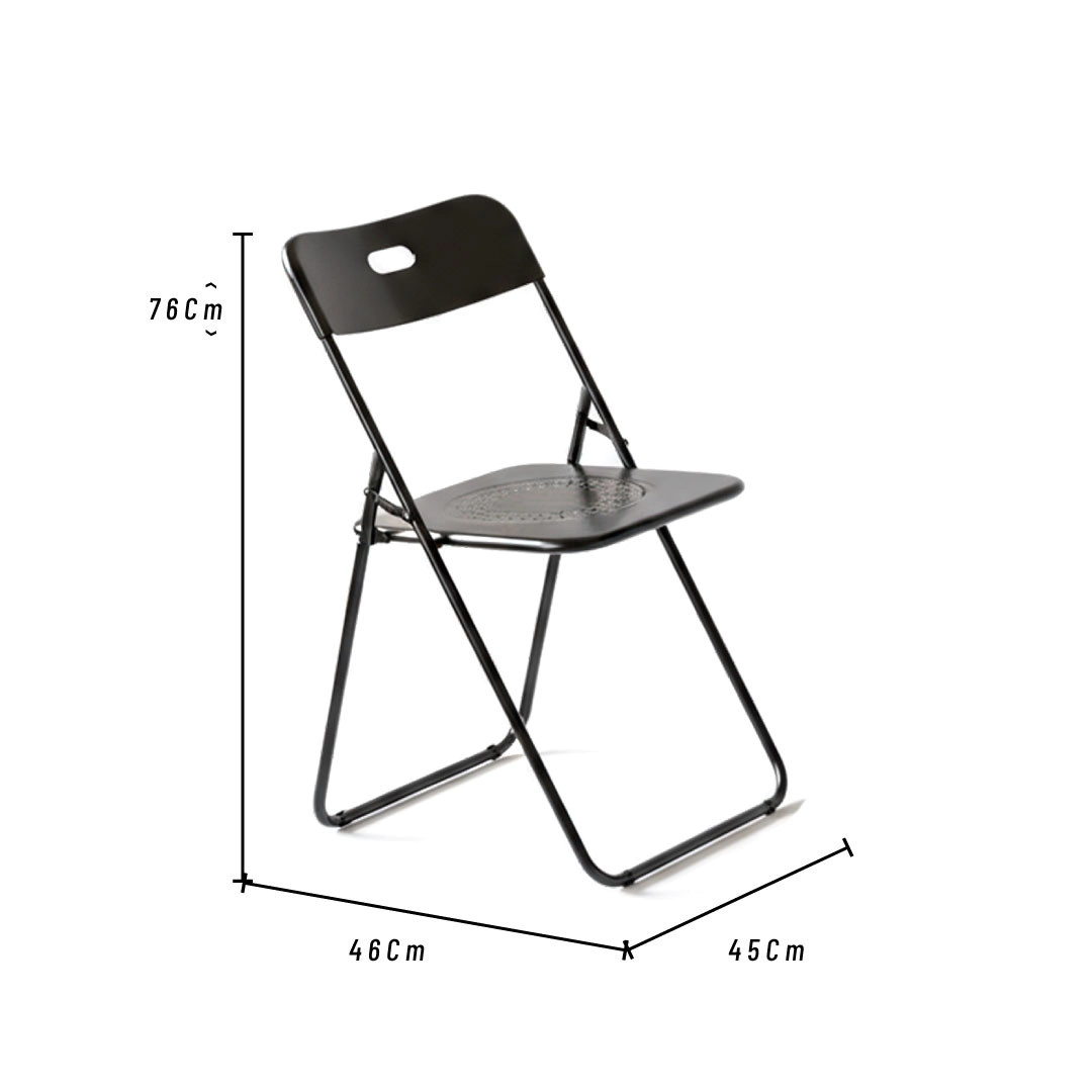 Diseño moderno, fabricada con un marco de metal que asegura resistencia y ligereza. El respaldo incluye un orificio circular para facilitar su transporte, y el asiento presenta un patrón decorativo perforado que combina funcionalidad y estilo. Su estructura plegable la hace ideal para espacios reducidos o uso temporal.