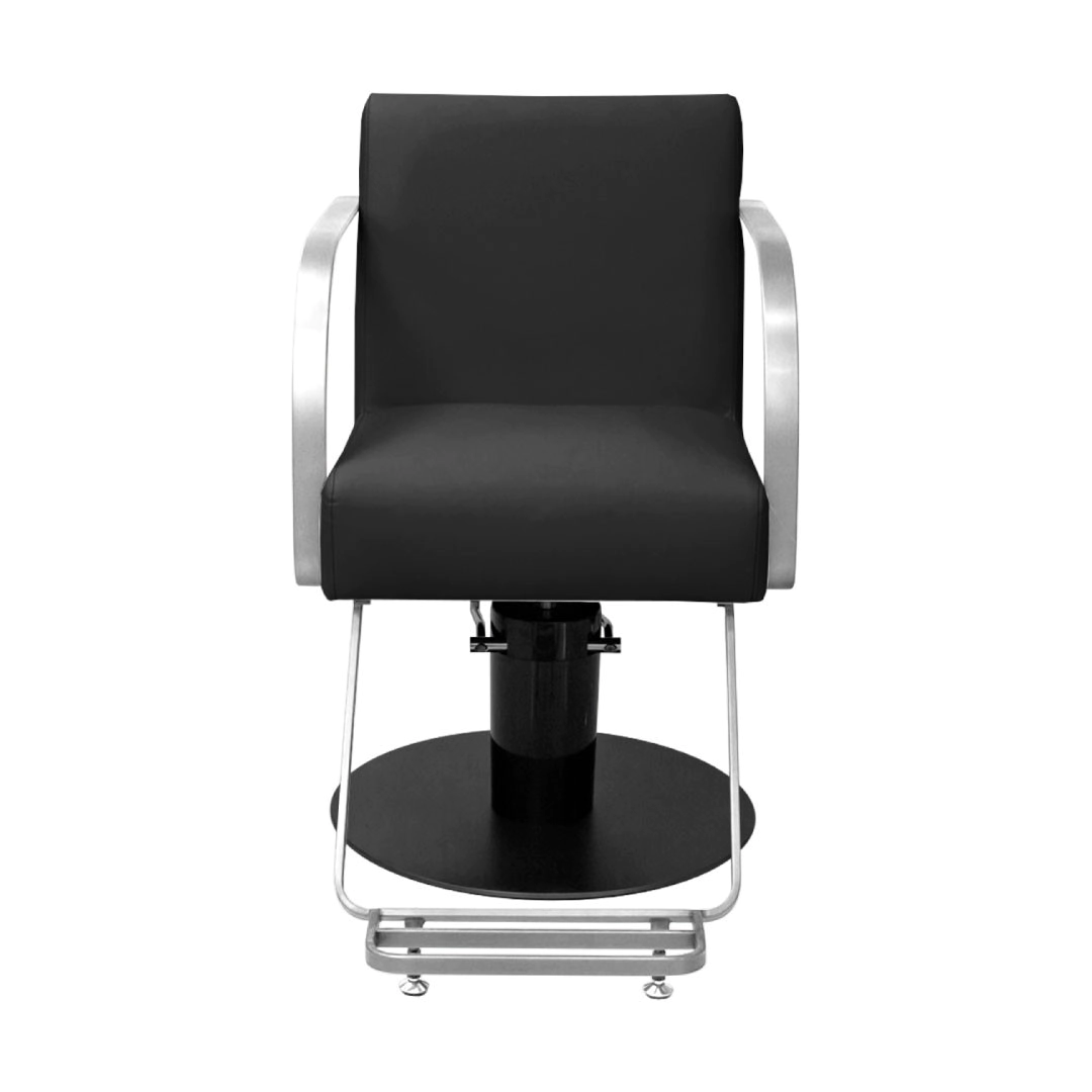 Diseño moderno y ergonómico, perfecta para salones de belleza o barberías. Está tapizada en cuero con un acabado liso y un respaldo alto y curvo para mayor comodidad. Los reposabrazos son anchos y están fabricados en metal cromado con una forma elegante y funcional. La estructura incluye una base circular con un sistema hidráulico para ajustar la altura, y un reposapiés también en metal. Su combinación de líneas limpias y materiales resistentes la hace ideal para un uso prolongado, ofreciendo tanto estilo como practicidad.