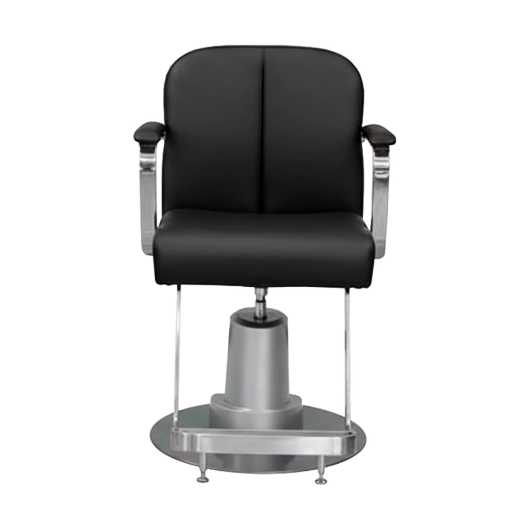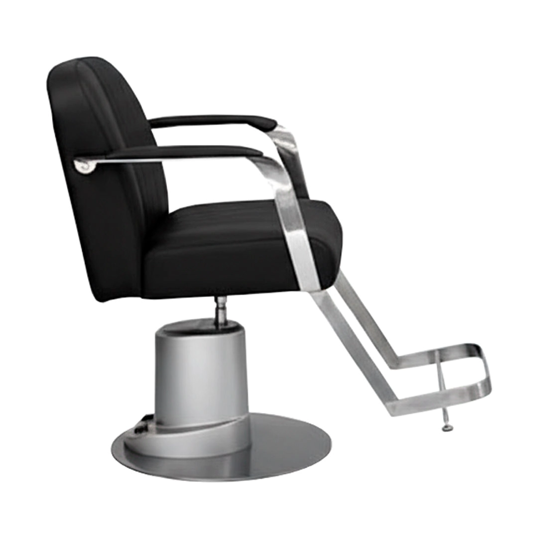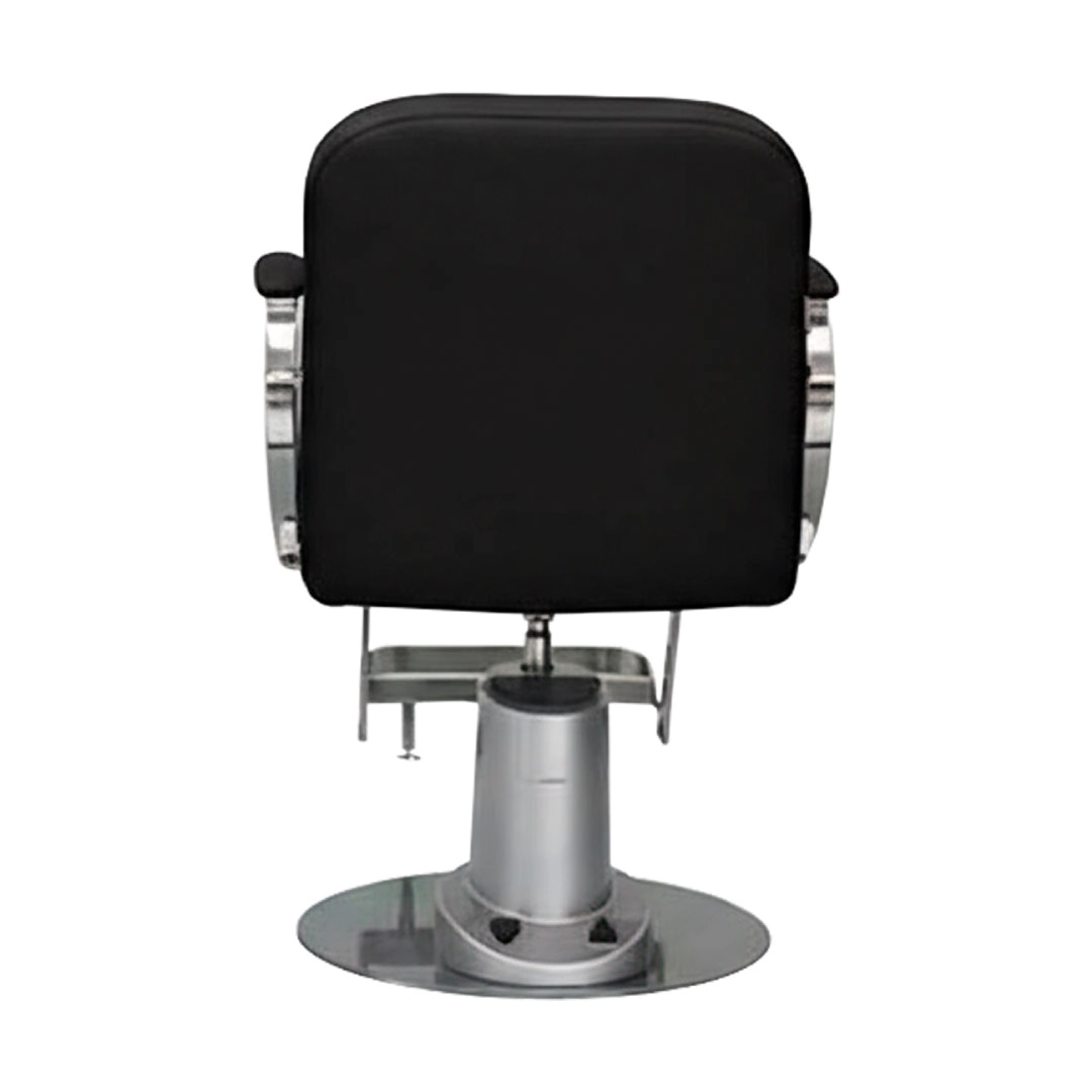 Modelo elegante y funcional, diseñado para salones de belleza o barberías. Está tapizada en cuero con un respaldo en dos secciones para mayor soporte ergonómico. Los reposabrazos son anchos y cuentan con acabados en metal cromado que aportan un toque moderno y resistente. La estructura incluye una base hidráulica electrica a bateria que permite ajustar la altura con facilidad, y un reposapiés también en metal para comodidad del usuario. Su diseño combina durabilidad con un estilo contemporáneo, ideal para un uso profesional prolongado.