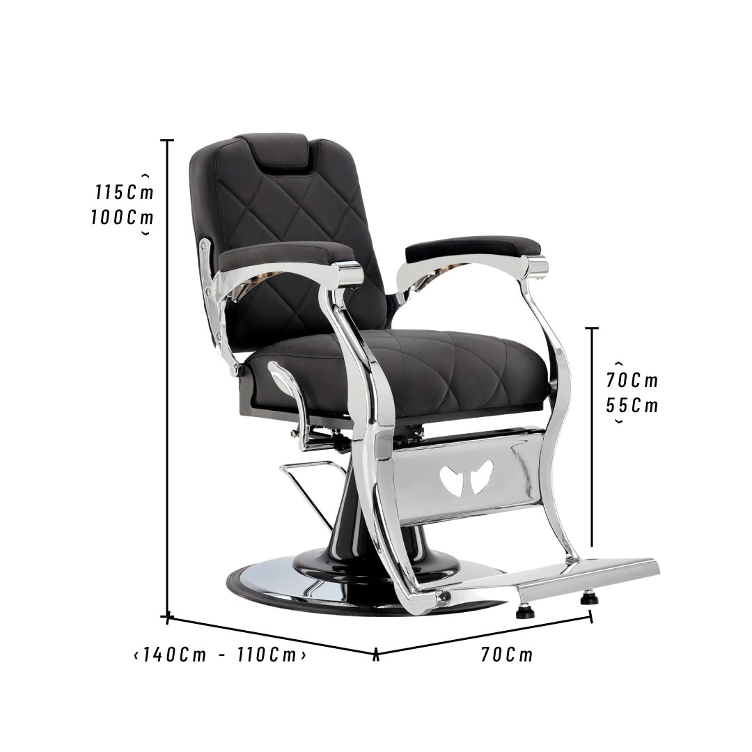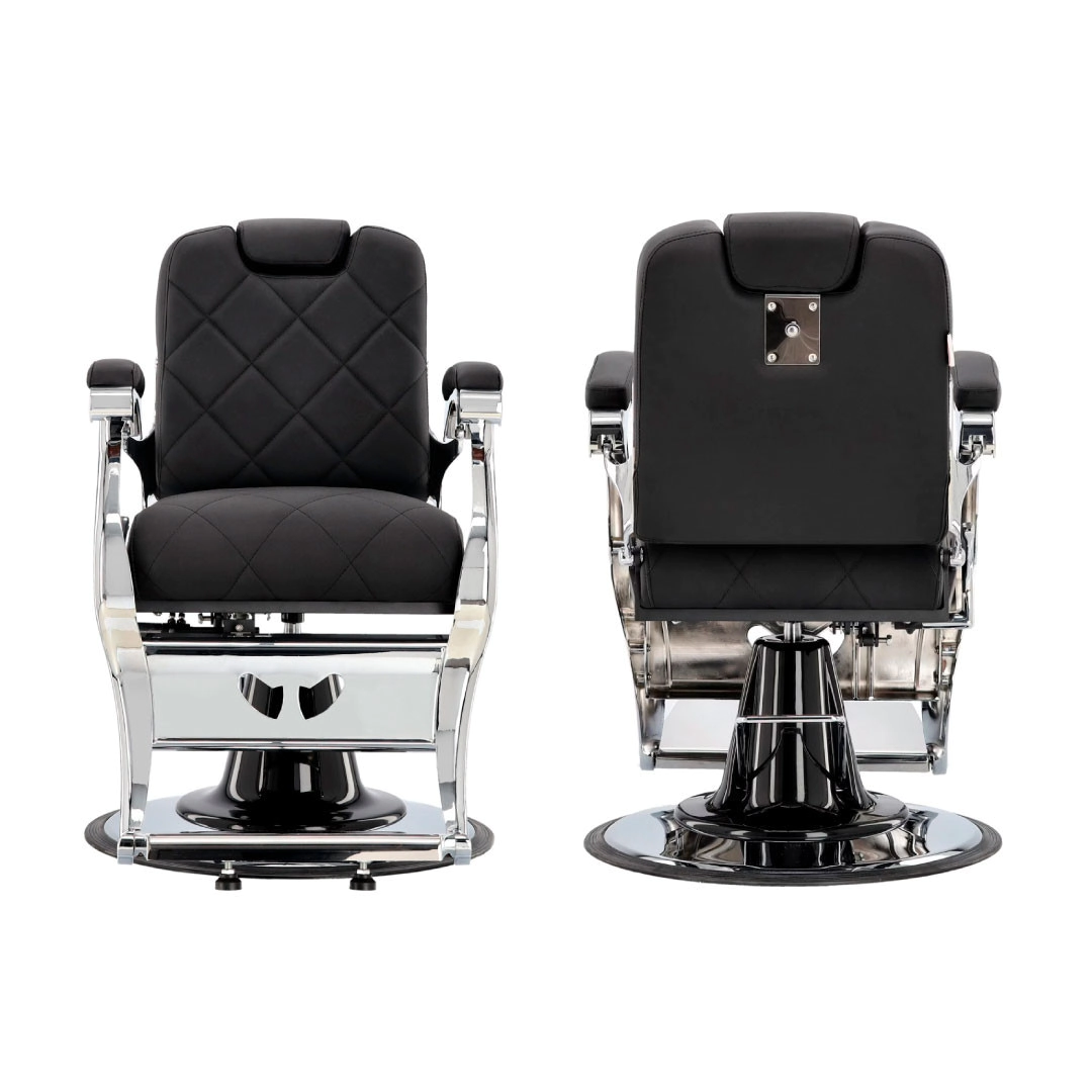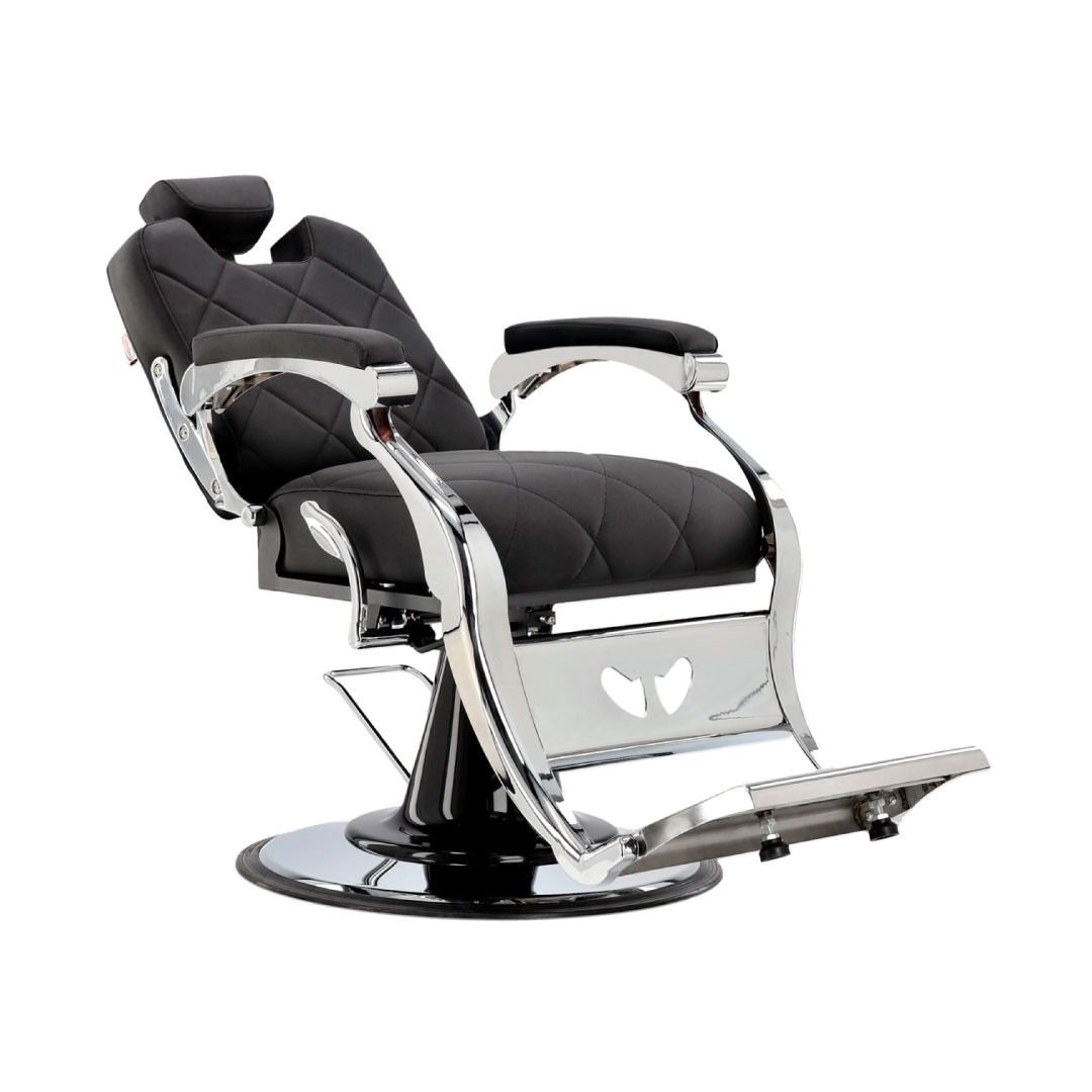 Diseño ergonómico y moderno, ideal para un entorno profesional. Cuenta con una estructura metálica cromada que le otorga un acabado brillante y resistente, combinada con un asiento y respaldo tapizados en cuero negro con un patrón de acolchado en forma de rombos, lo que añade un toque de elegancia y confort. Los brazos son anchos y también están forrados en cuero, con un soporte metálico curvado que proporciona estabilidad y un estilo distintivo. La base es circular y giratoria, permitiendo un movimiento de 360 grados, mientras que el reposapiés ajustable y la estructura reclinable ofrecen versatilidad para adaptarse a diferentes posiciones.