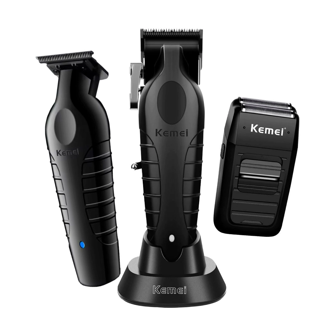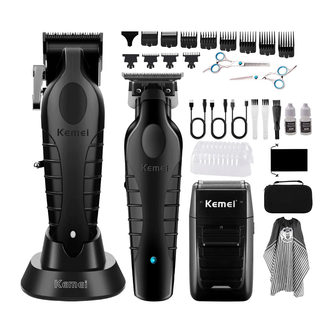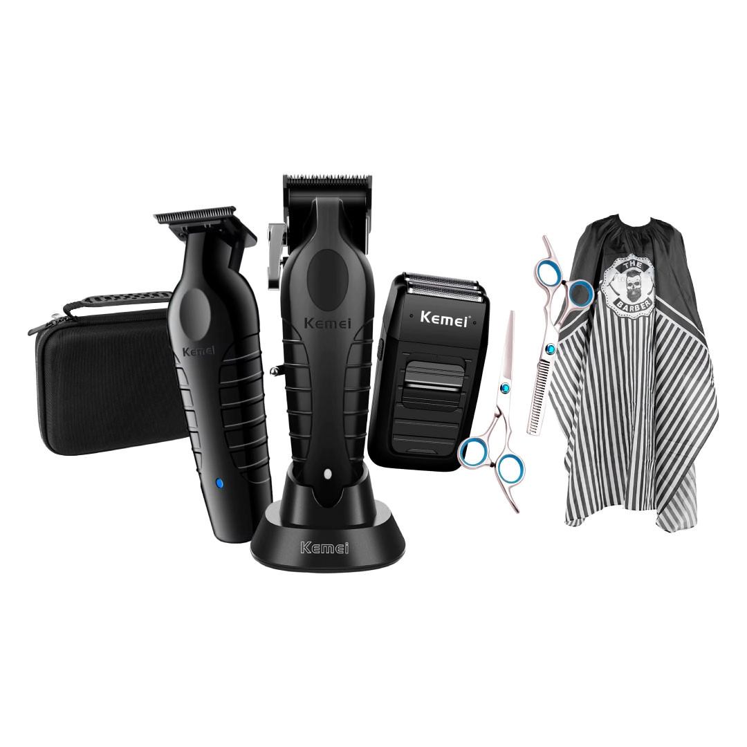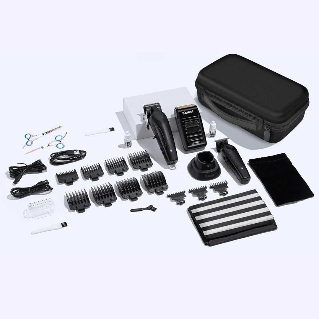 Incluye: Máquina de corte, Máquina patillera, Shaver, Tijera filo navaja, Tijera de pulir, Capa, Estuche, Alzas, Aceite lubricante, cepillo de limpieza ,cable, base de carga (para maquina de corte) y Funda (para shaver)