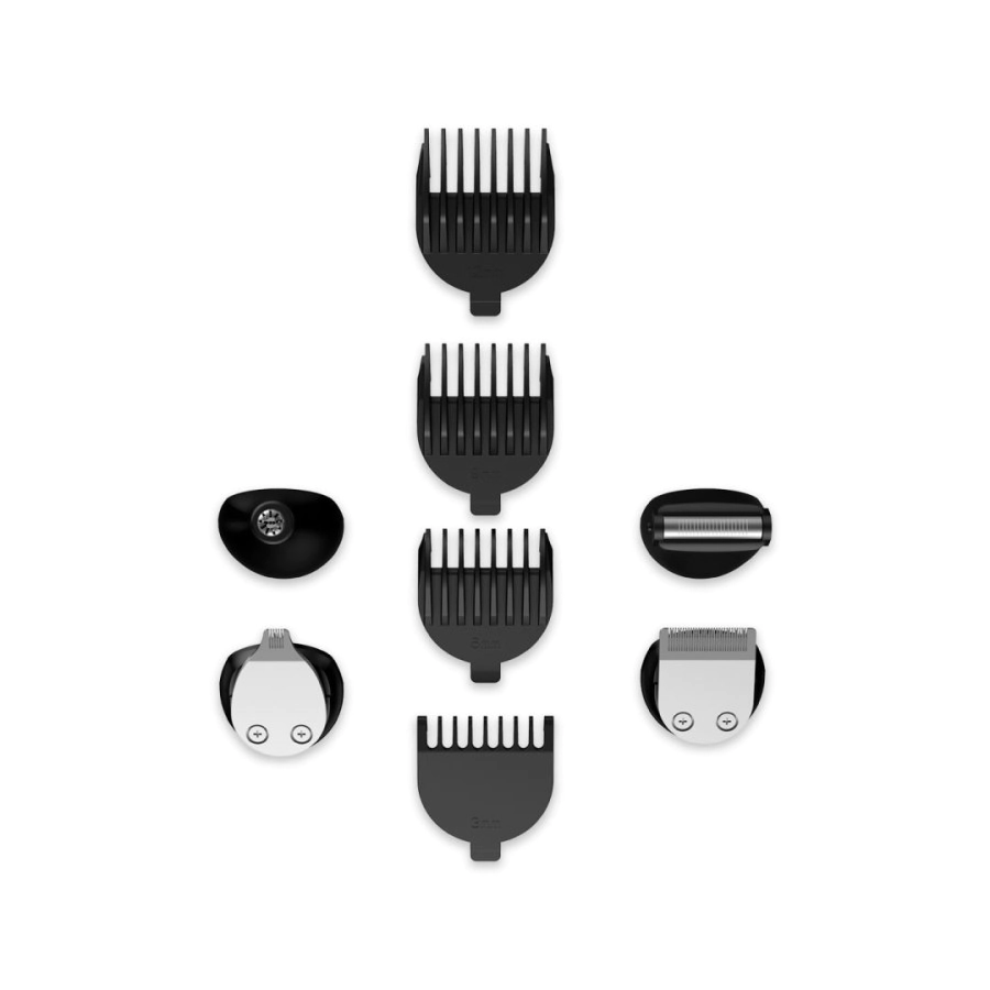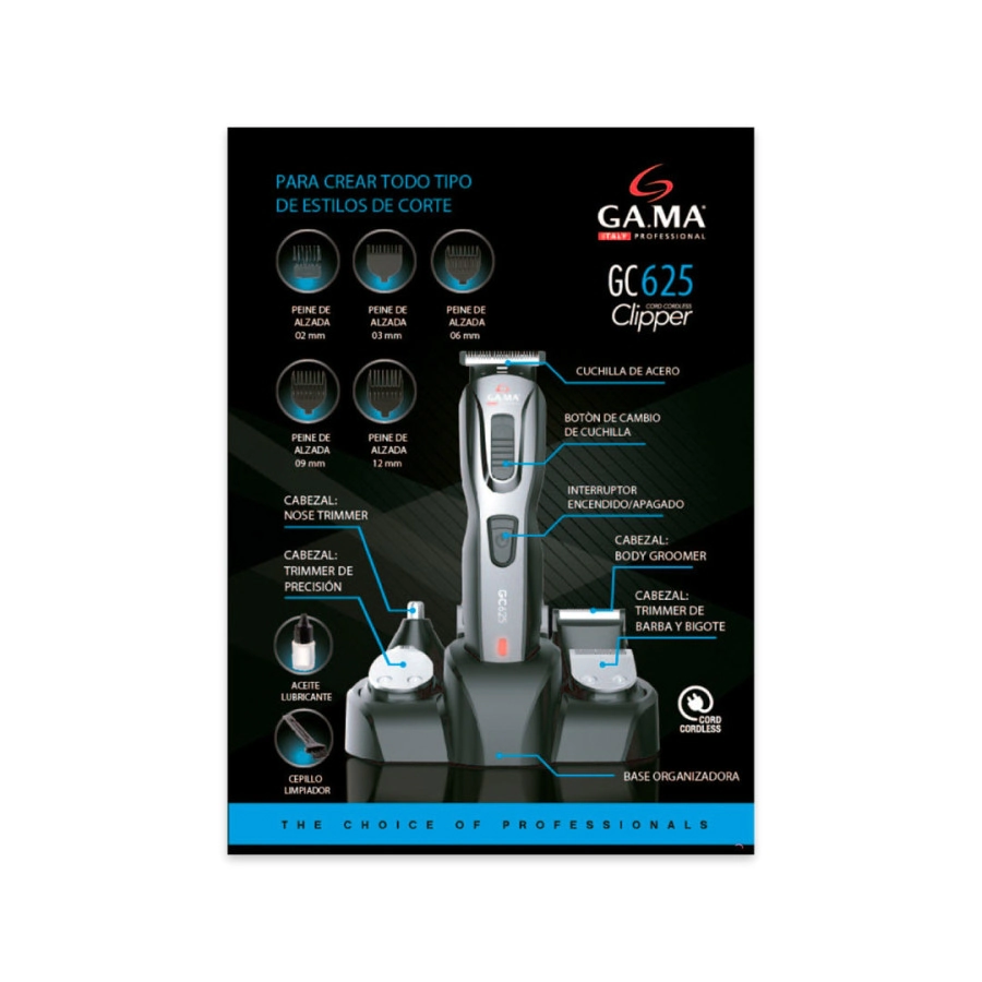 Con lámina en acero inoxidable, el Clipper Multi-Styler GC 625 presenta 10 posibilidades de corte y acabado en el mismo producto. Cuenta con 5 cabezales intercambiables y 5 peines guía.