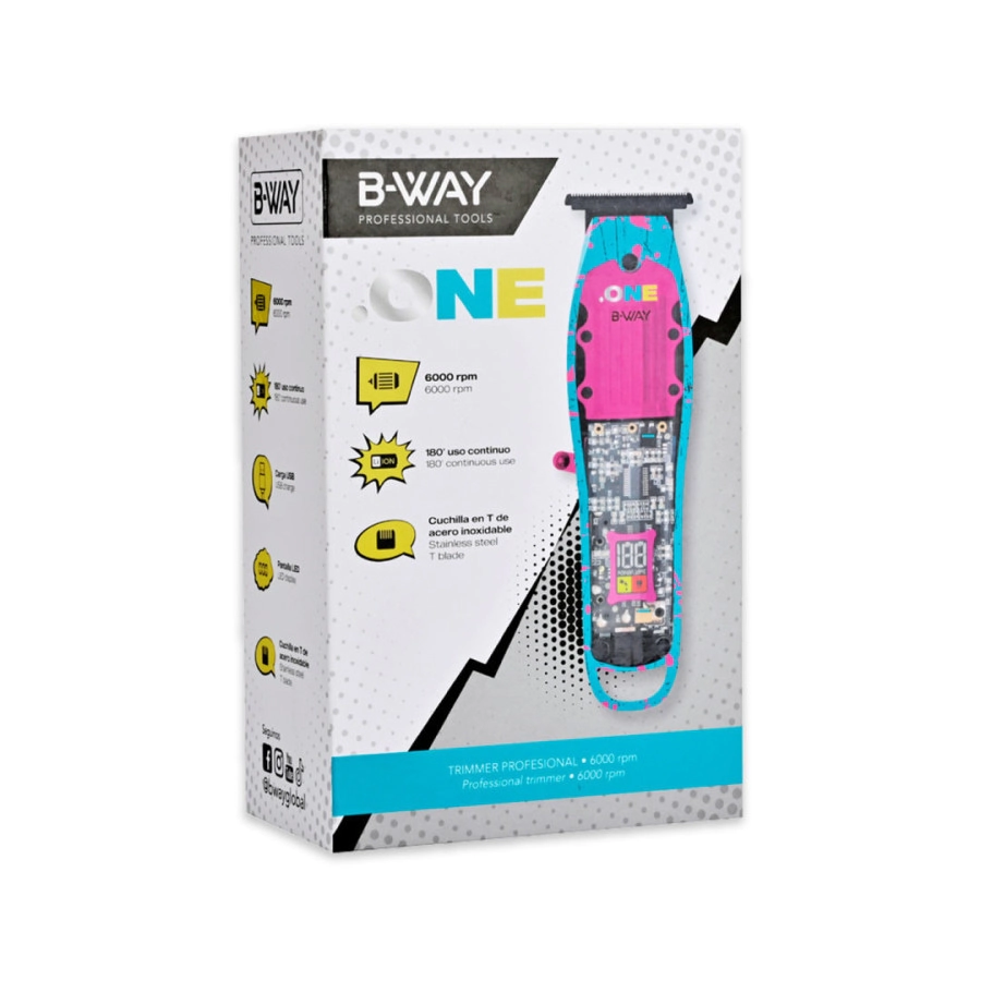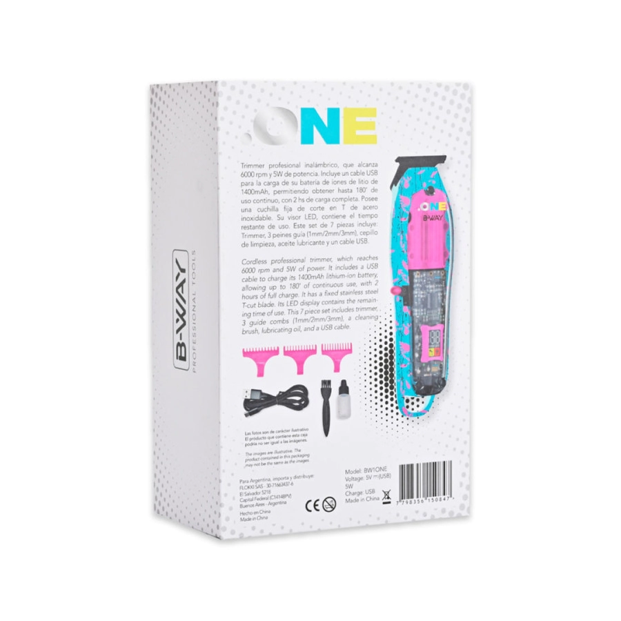 Trimmer profesional inalámbrico, que alcanza 6000 rpm y 5W de potencia. Incluye cable USB para la carga de su batería Li-Ion de 1400 mAh, permitiendo obtener hasta 180' de uso continuo, con 2 hs de carga completa. Posee una cuchilla fija de grafito para corte en T y cuchilla móvil de cerámica. Cuenta con un Display LED, con indicación de carga y de mantenimiento. Este set de 7 piezas incluye: Trimmer, 3 peines guía (1mm/2mm/3mm), cepillo de limpieza, aceite lubricante y un cable USB.