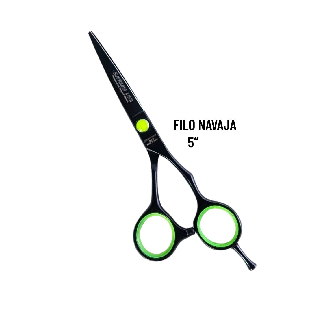 Presenta un diseño moderno en color negro con detalles en verde lima. Las cuchillas rectas y afiladas son perfectas para cortes precisos, mientras que los mangos ergonómicos, con anillos verdes, ofrecen un agarre cómodo y seguro. El botón de ajuste amarillo añade un toque distintivo. Ideal para uso profesional en peluquería.