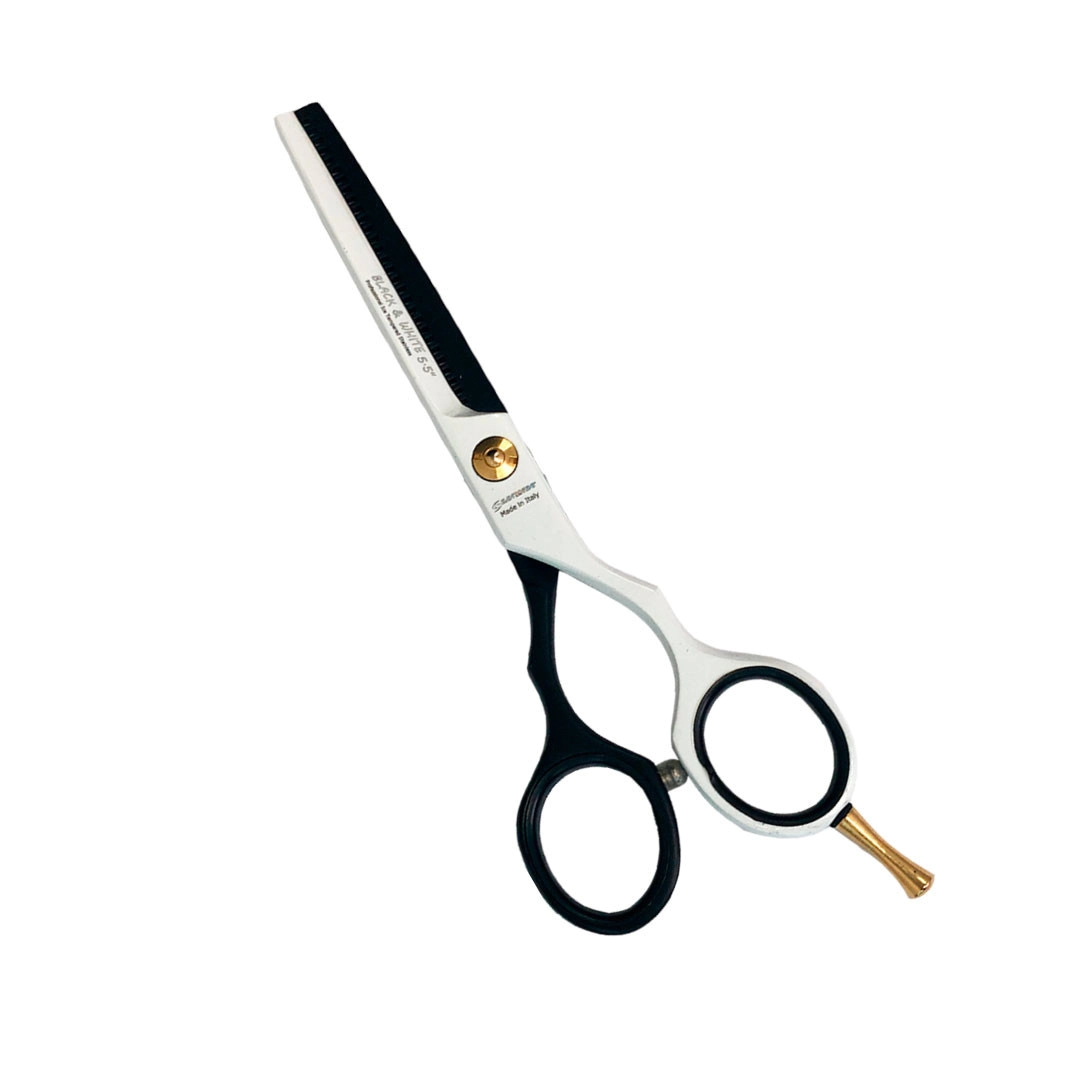Black & White, cuenta con una hoja dentada ideal para texturizar y adelgazar cabello. Su diseño combina un acabado blanco y negro, con mangos ergonómicos que ofrecen un agarre cómodo y seguro. El botón de ajuste dorado y la punta del mango en dorado añaden un toque distintivo. Perfecta para uso profesional en peluquería.